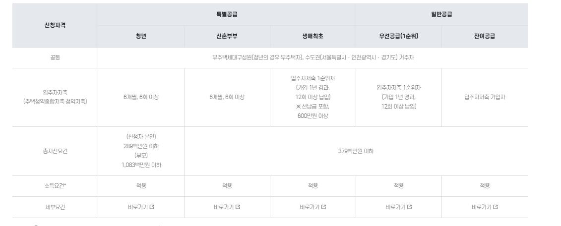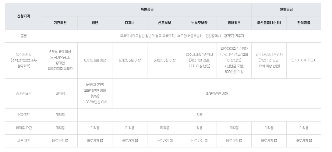 소득 기준: 도시근로자 월평균 소득의 120% 이하(맞벌이 부부는 130% 이하)를 적용합니다.